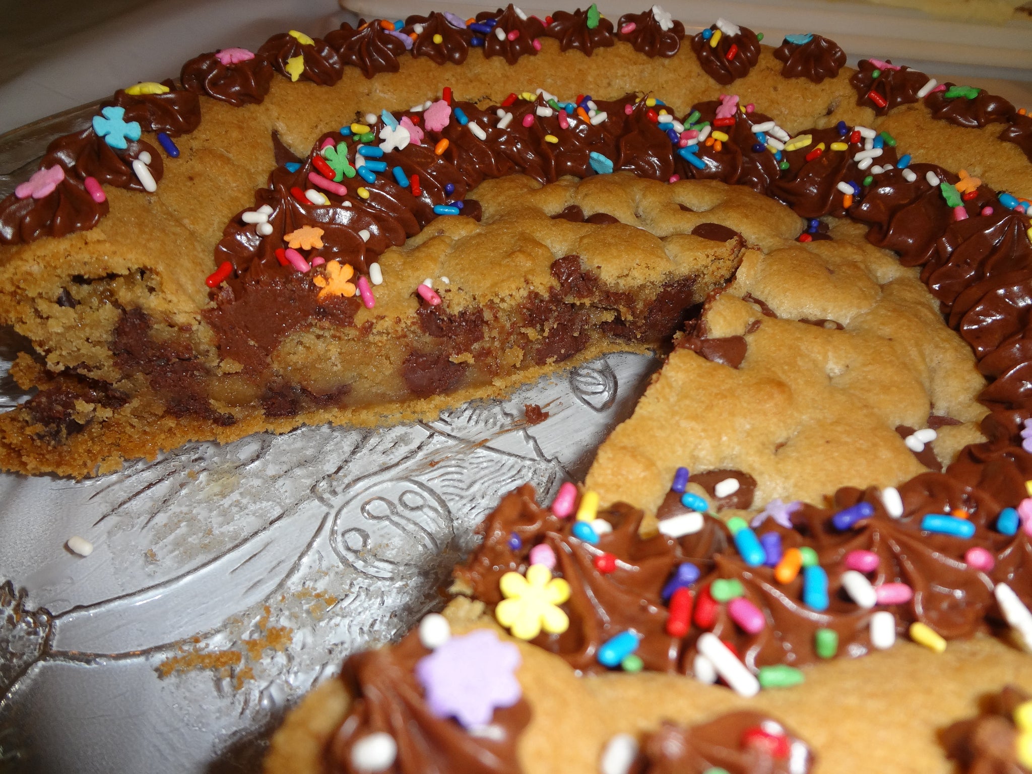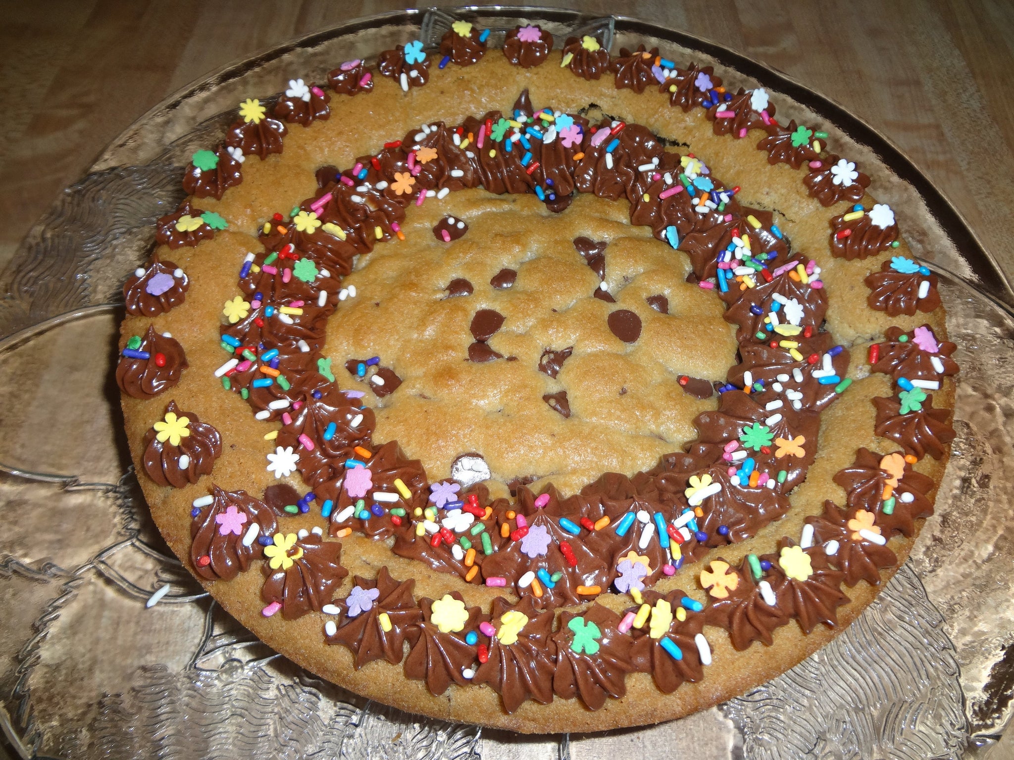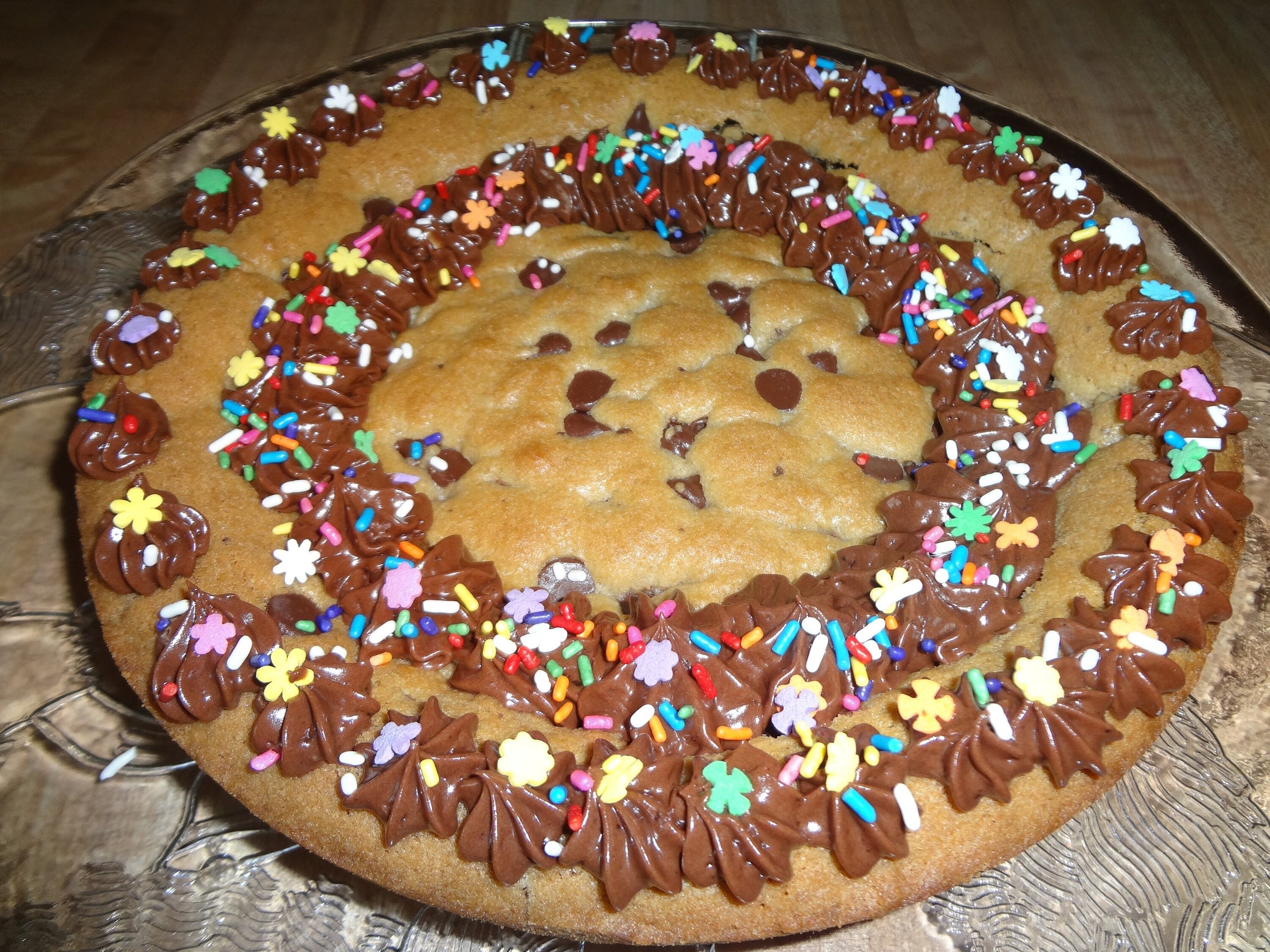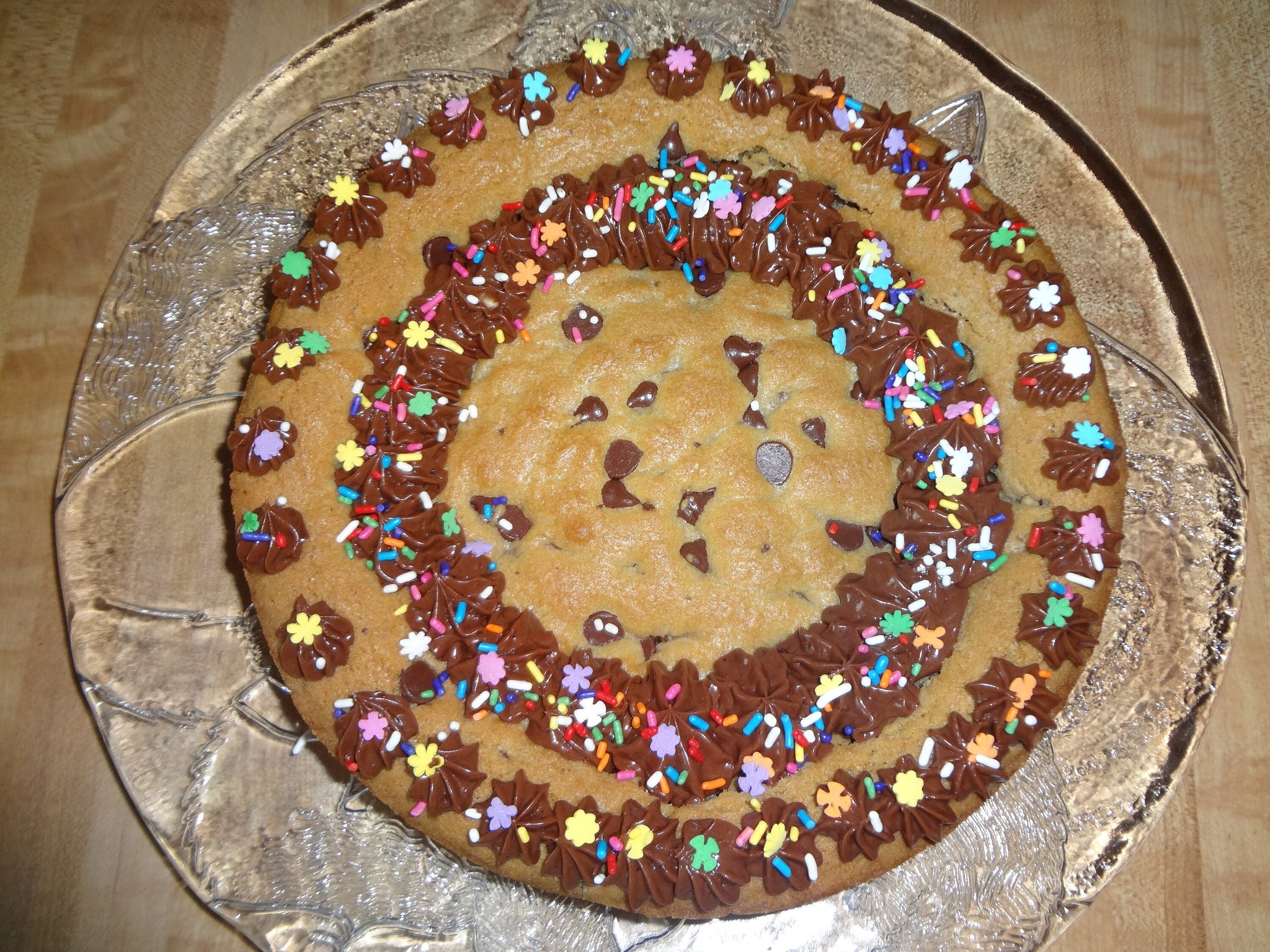 Party Time Homemade Frosted Chocolate Chip Cookie Cake. Beautiful, rich and chewy, this cookie cake is perfect for any celebration.