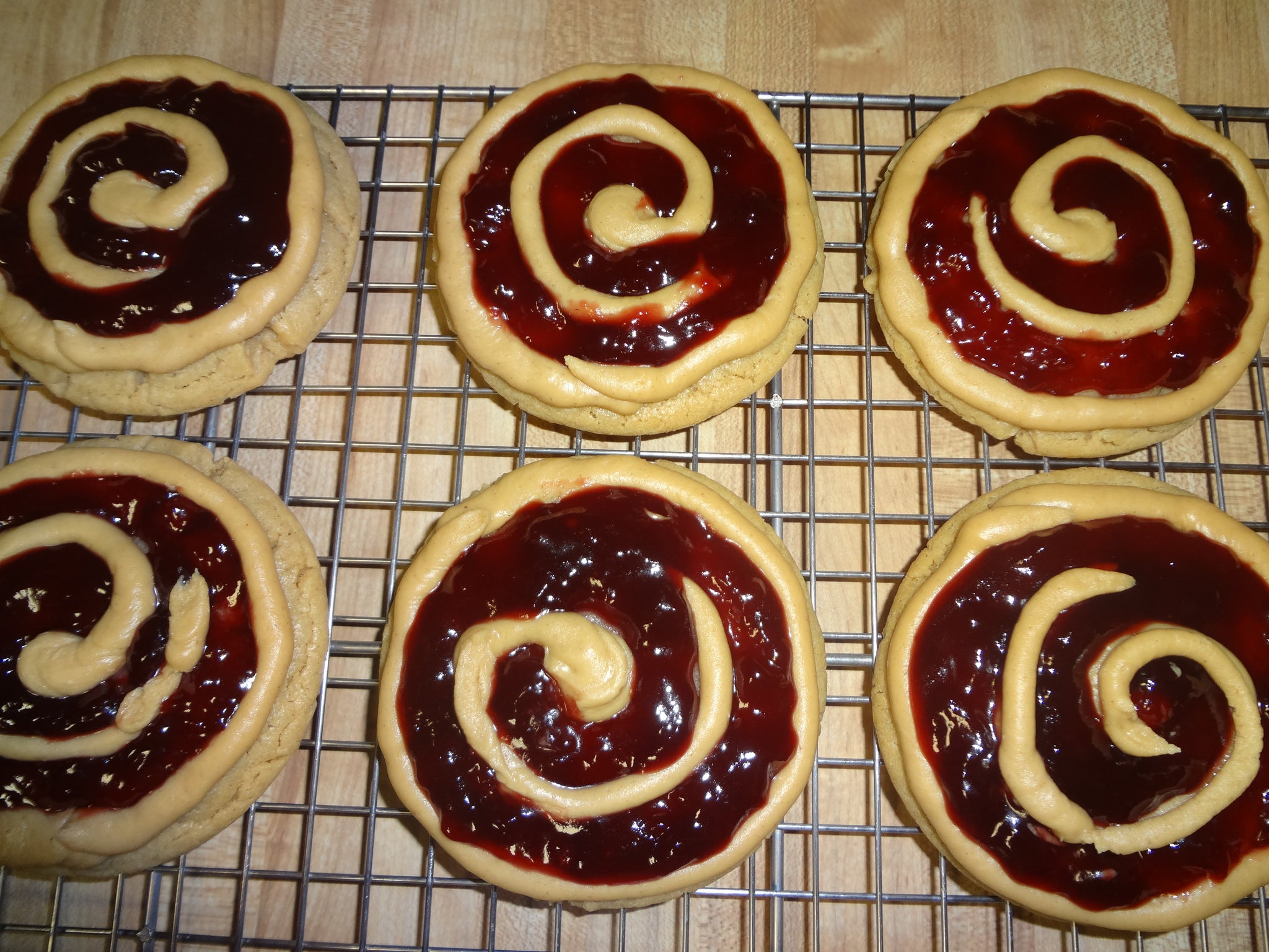 Copycat Crumbl Homemade Peanut Butter and Jelly (Jam) Cookies. The ultimate comfort food cookie, they are made with thick peanut butter cookies and frosted with peanut butter buttercream swirls and jam swirls. Very large and delicious cookies. Comes with choice of jam flavor.