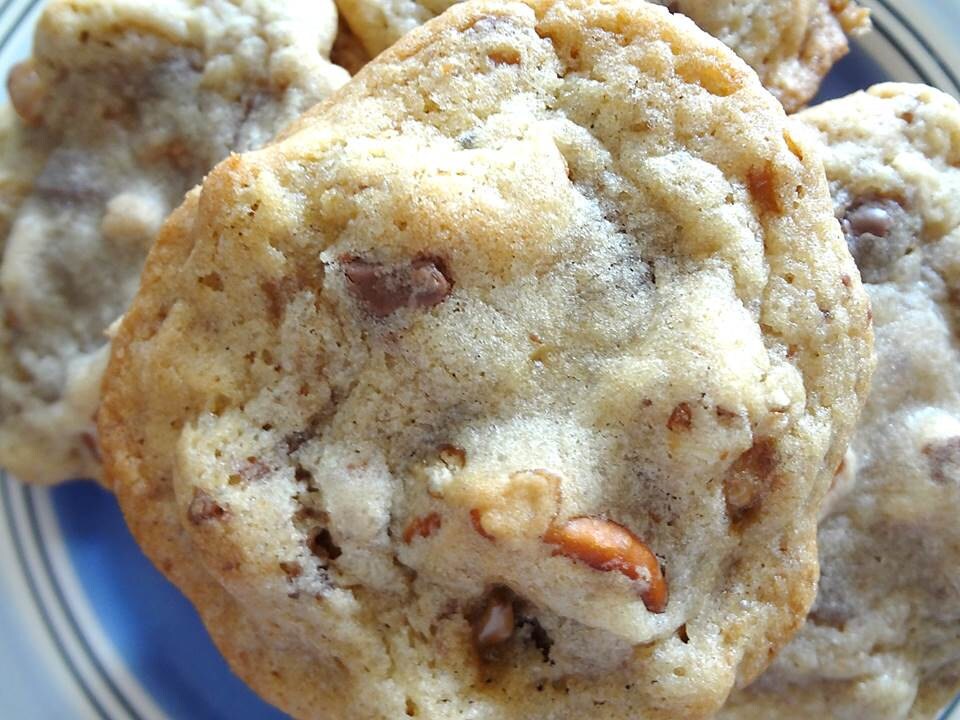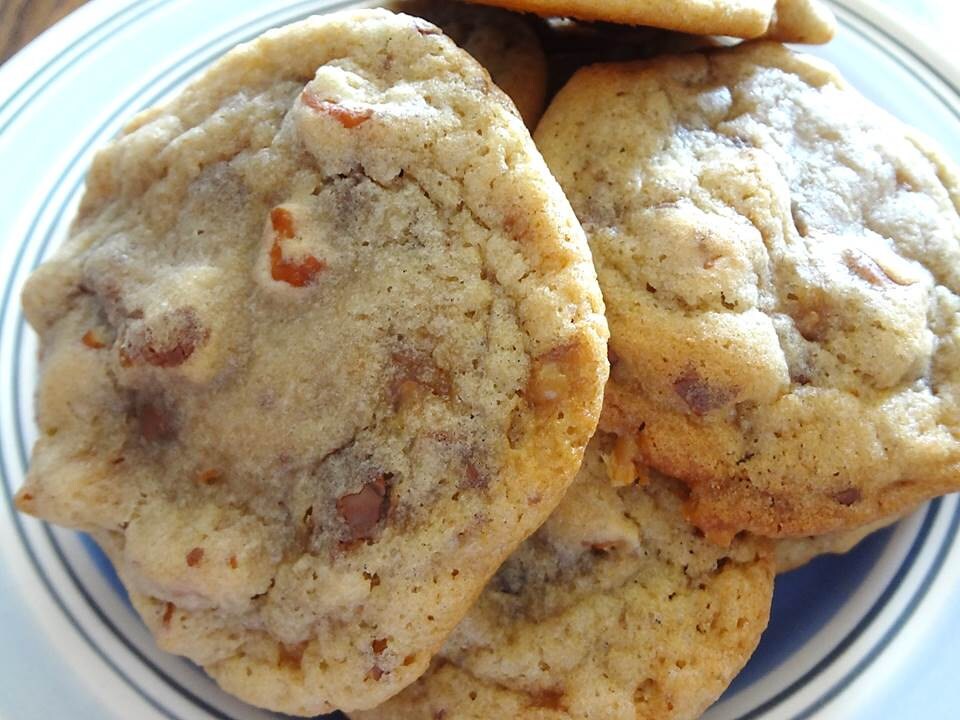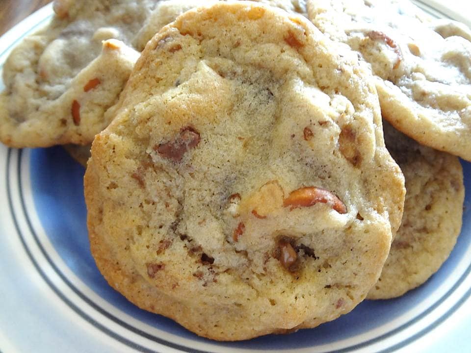 Delightfully Decadent Homemade Rolo Stuffed Pretzel Toffee Cookies. The crunch and saltiness of the pretzels combined with the gooey caramel make these very satisfying cookies. The addition of the toffee pieces adds much more flavor to these salty & sweet cookies. Put them in the microwave for a few seconds and WOW!