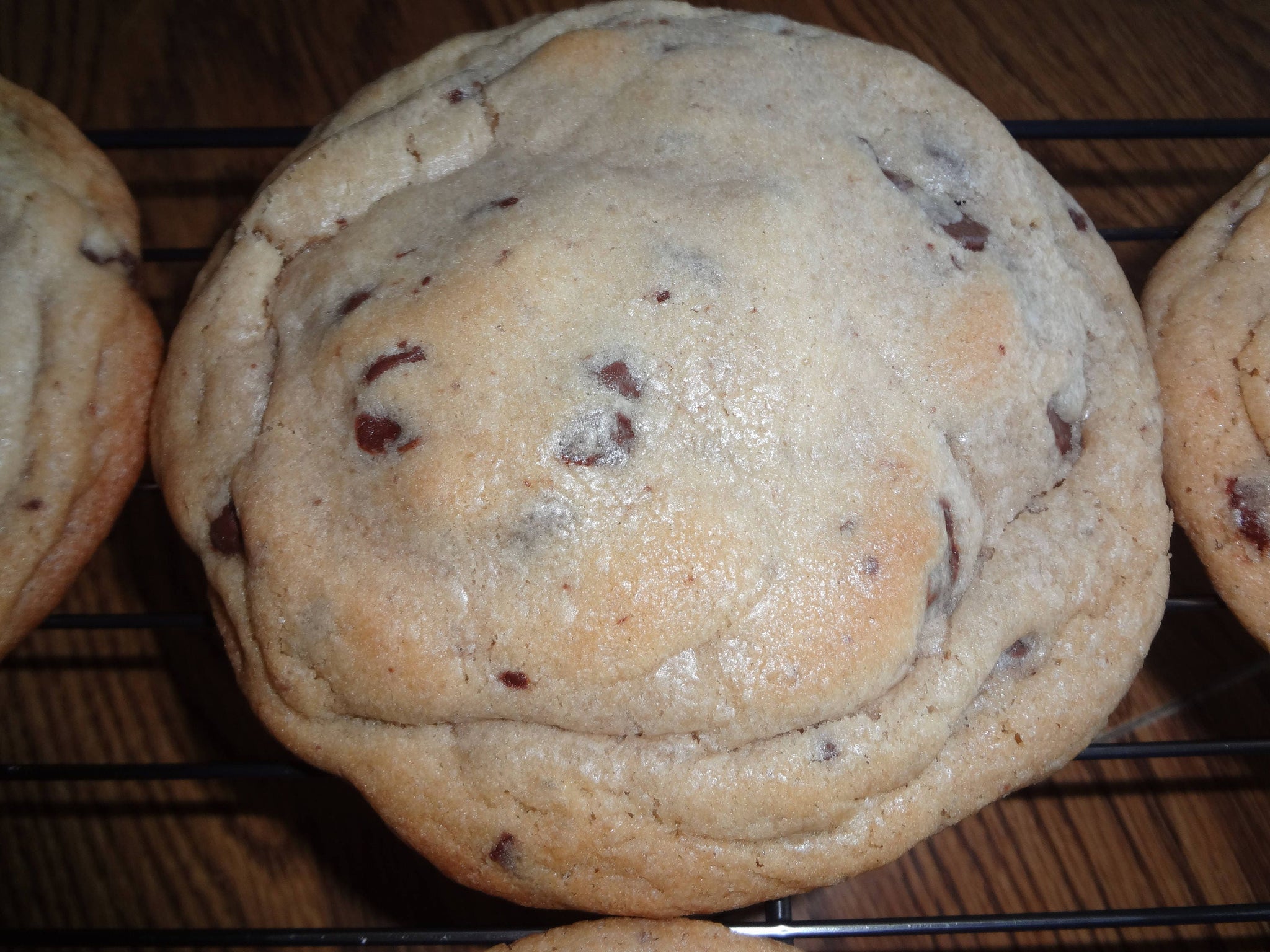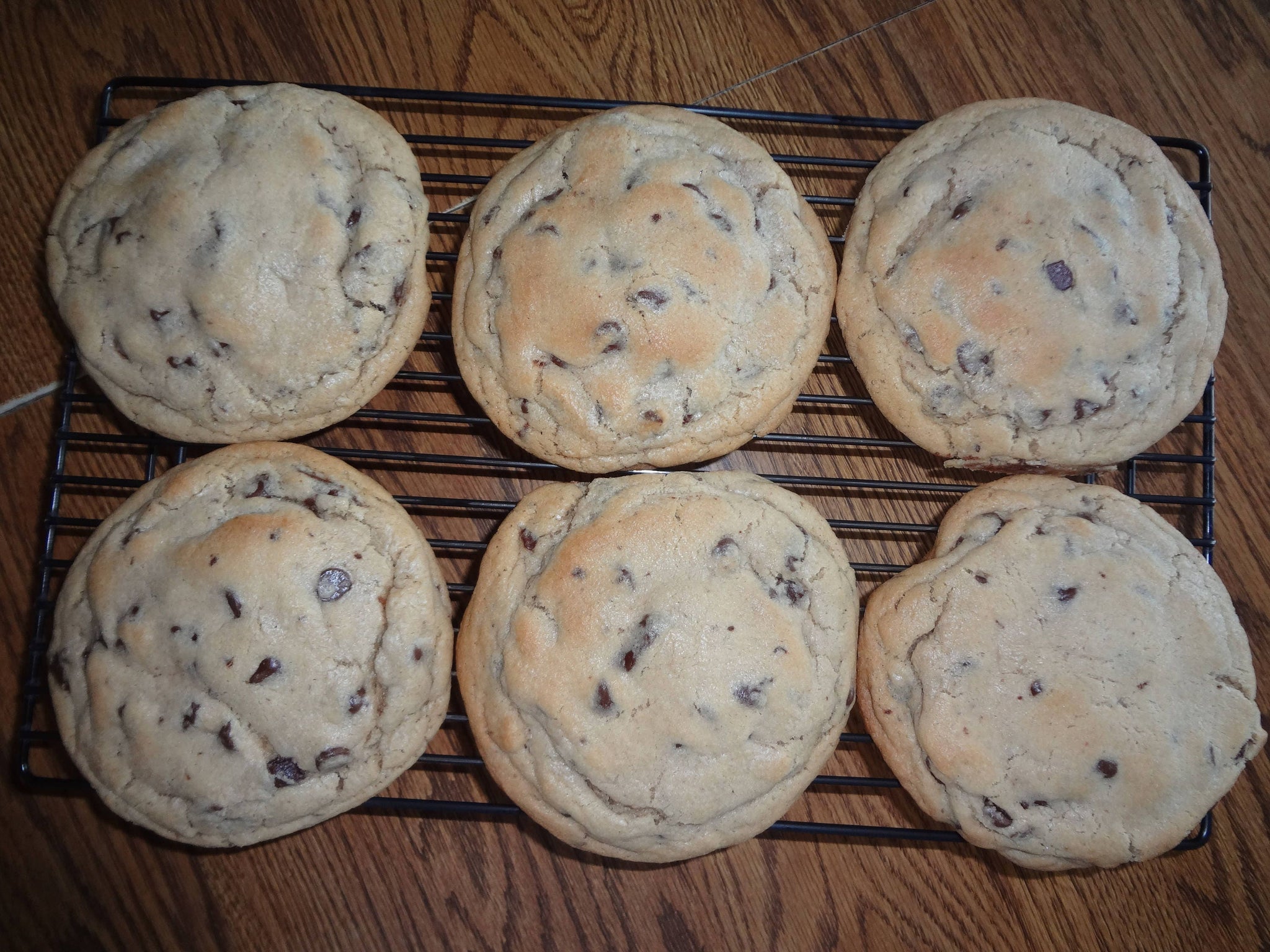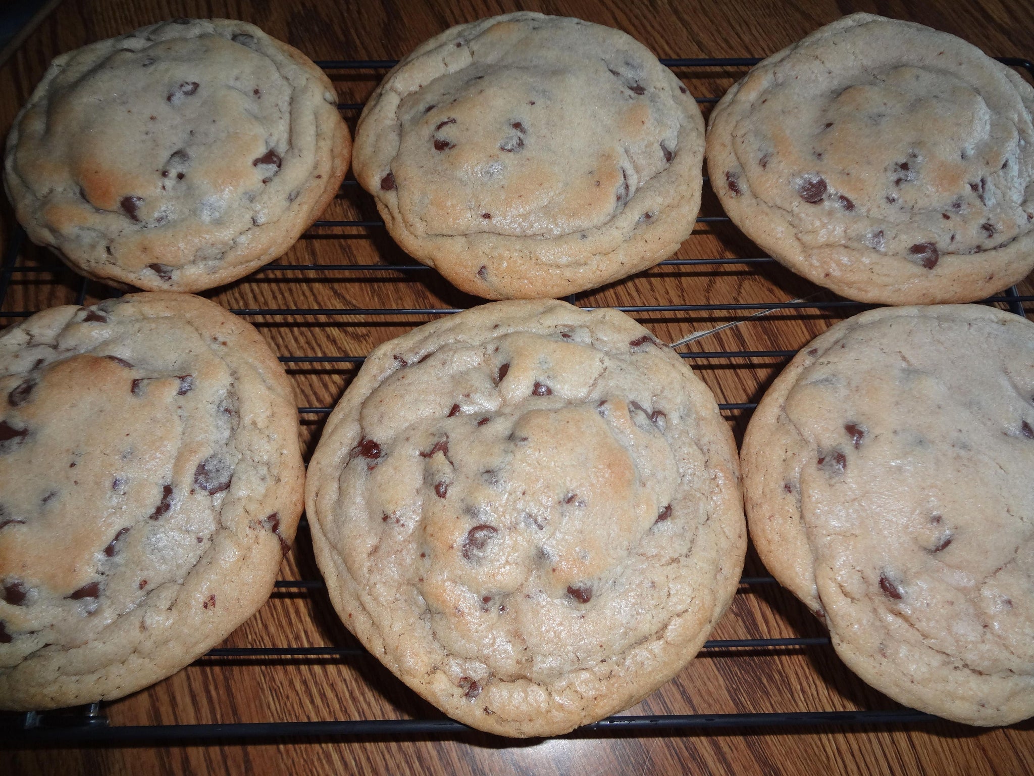 HUGE Homemade Half Pound Chocolate Chip Cookies. Seriously... each cookie weighs 1/2 pound. Slightly crispy around the edges, with a gooey center and balanced sweetness. Makes a perfect treat to share or go ahead and eat an entire one yourself.