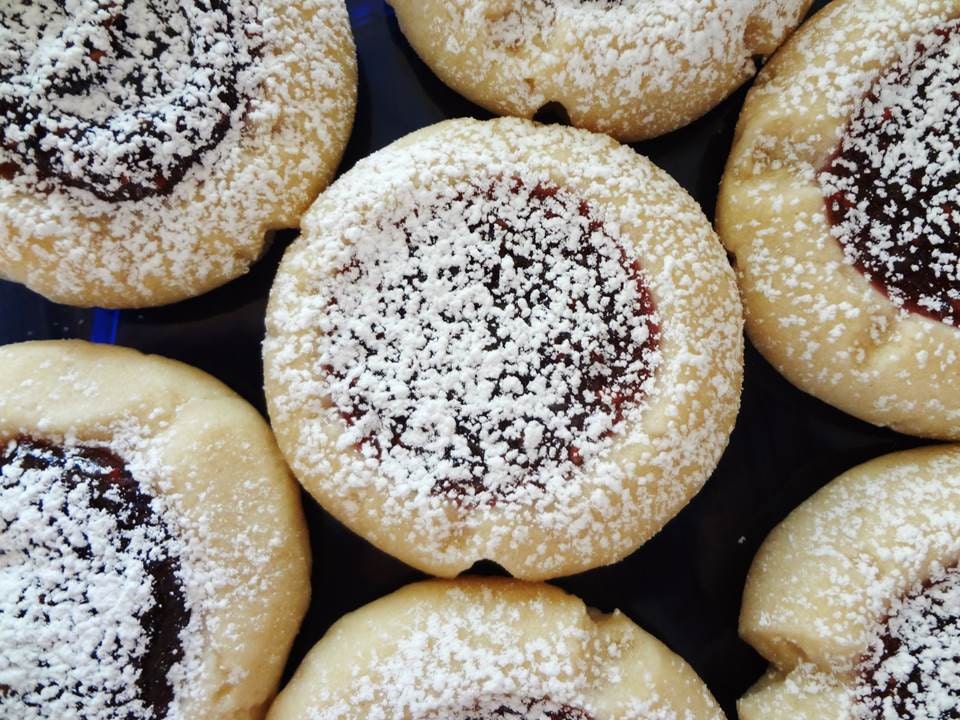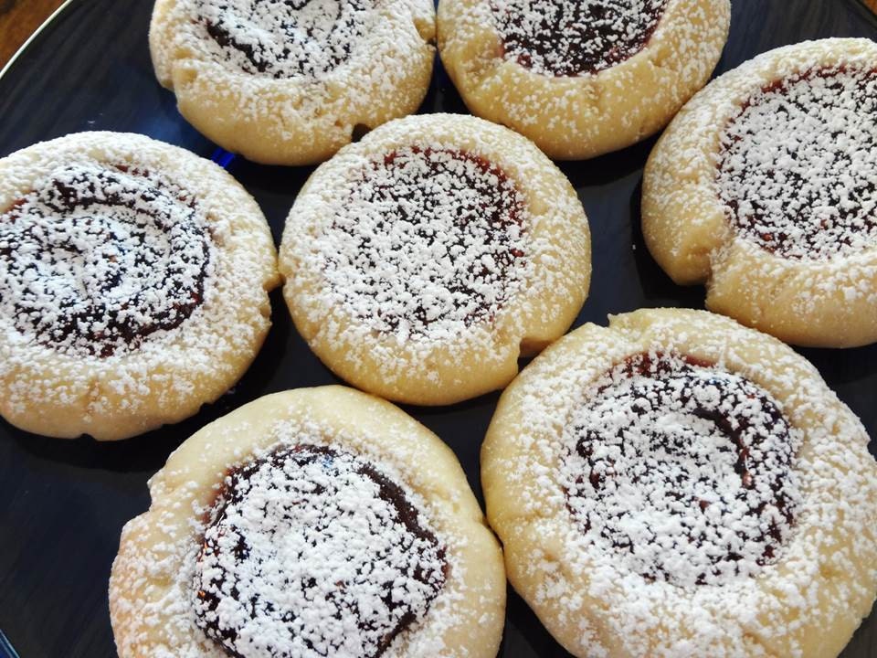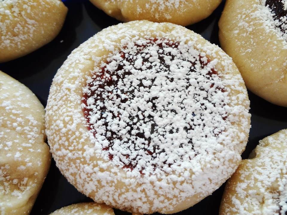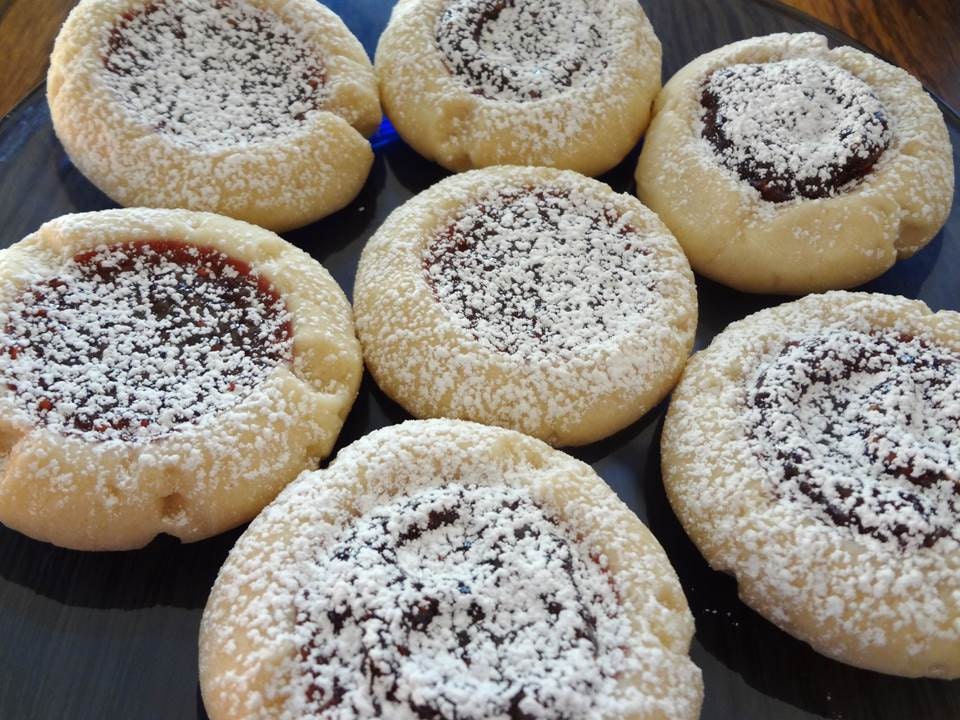 Soft and Luscious Homemade Thumbprint Cookies. These little gems are soft and buttery with the sweetness of fruit preserves and a dusting of Confectioners' Sugar to finish them off. These are cookies made with preserves, so keep in mind they will have seeds. If you would like jam instead of the preserves, please include a note with your order stating you would like jam and the flavor.